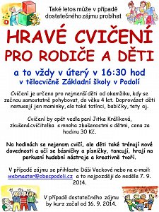 Byla vložena nová akce do Kalendáře akcí – Hravé cvičení pro děti a rodiče – uzávěrka přihlášek – 07.09.2014.