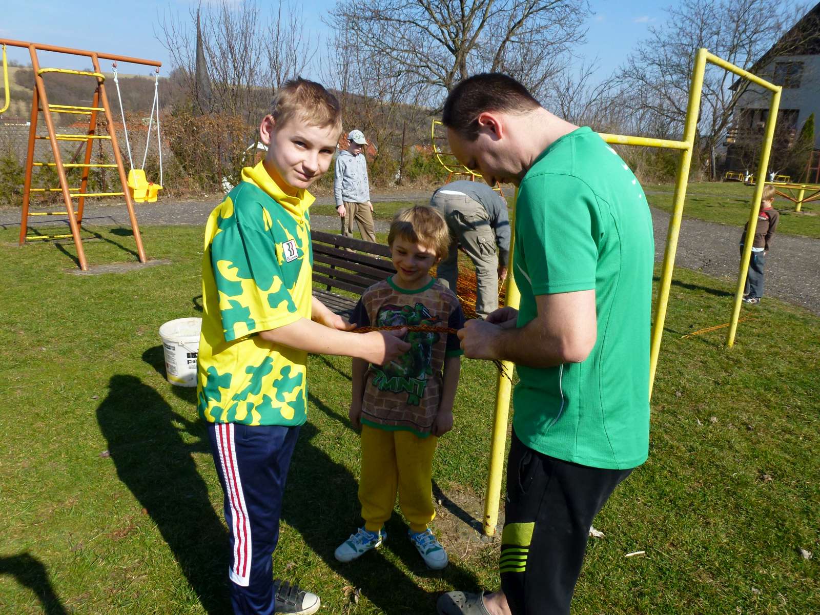 Slunečné nedělní odpoledne patřilo na hřišti na Záhumní pletení žil a přípravám na Velikonoce. Kromě toho malé děti vyzkoušely novou houpačku, která na hřiště přibyla.