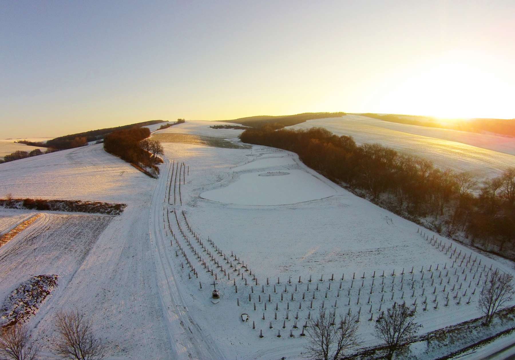 Další z pohledů z výšky – tentokrát na zasněženou obec a mokřady.